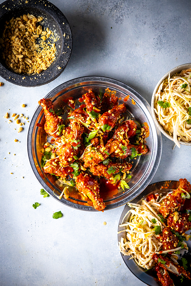 Air-Fried Sweet and Sticky Korean Chicken Wings with Kimchi Slaw Salad
