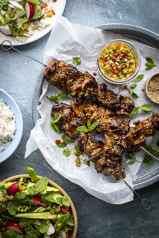 When my summer cooking needs to really step up the flavour there is one Thai dipping sauce I always turn to that instantly provides the sweet, salty, spicy sour flavours I love so much about the food of Thailand. Nam Jim is traditionally served with grilled seafood but works well with almost anything that comes smoking off a hot grill. I like to serve it with skewers of sticky grilled pork with a chopped vegetable salad in the summer months when the BBQ is lit. Serve with steamed rice to make a more generous meal.