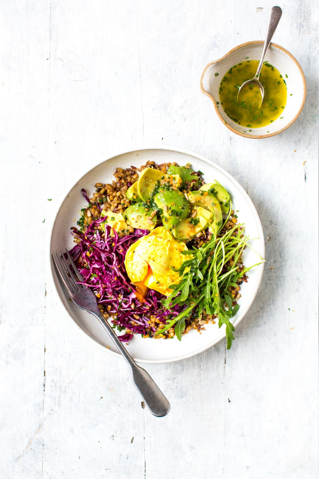 On the Los Angeles theme of eggs, another favourite spot of ours was Honey Hi which served a peak hipster crowd but had its roots in really great food. This California Lunch Bowl with Turmeric Poached Egg takes its inspiration from there. The little trick of poaching the eggs in turmeric spiked water, leaves you with sunshine yellow exteriors ideal for bright eating. Although grain bowls have had a bit of a bad rap for being a bit faddy, they are quick to make and tasty too. I treat this type of lunch or dinner as an opportunity for a fridge clear-out and anything goes here – roast vegetables, leftover meat, pickled cucumber – basically whatever takes your fancy. Ready-cooked tins of lentils are a great time-saving ingredient.