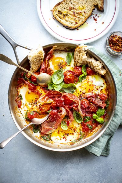 For a speedy option with inspiration slightly closer to home, what about my One Pan Tomato Breakfast Eggs – these are plonked onto a busy table for a crowd throughout the year and are always a winner. Not just because they are easy to make but also because they can be adapted to whatever numbers you need to serve too. If you ever spot tins of cherry tomatoes, snag at least six, they are wonderful in this recipe and a good replacement for the fresh variety which can be like bullets this time of year. Serve the pan with plenty of sourdough toast for dipping purposes and you have the bones of an excellent brunch.