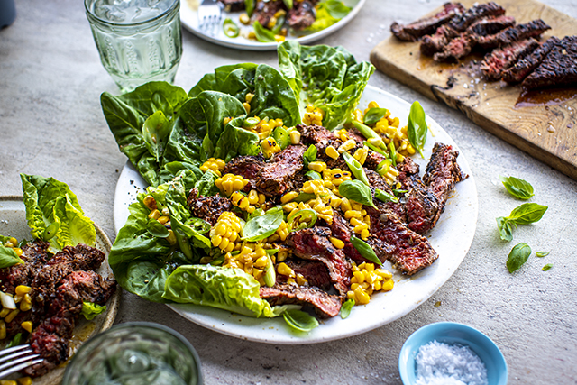 Bavette or flank steak is a great cut of beef for the BBQ and cooked for a couple minutes either side until medium rare, it’s a fabulous sharing meat. Great for fajitas and tacos but in the easy steak platter here I serve it with basil and sweetcorn over baby gem lettuce leaves. It can be served straight to the table and everyone can help themselves.