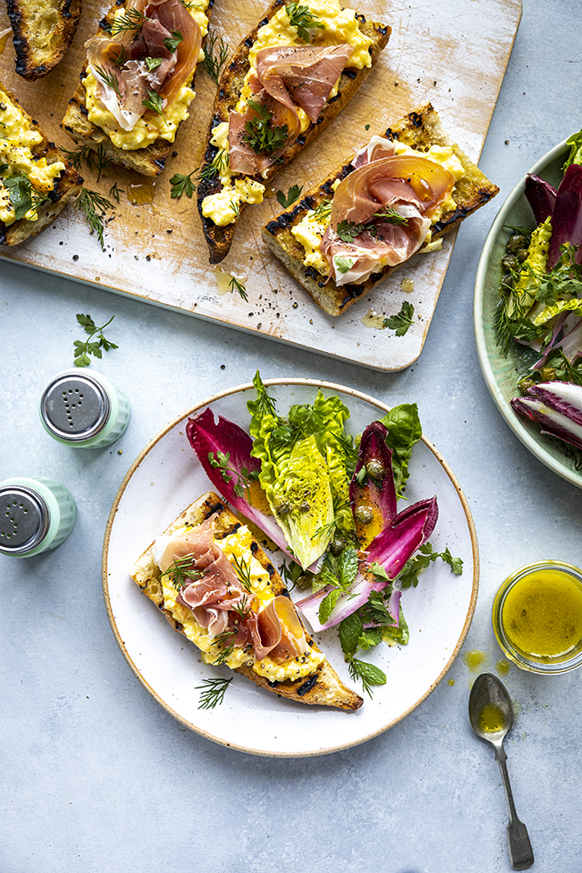 Egg Salad Tartines with Prosciutto & Picked Herbs
