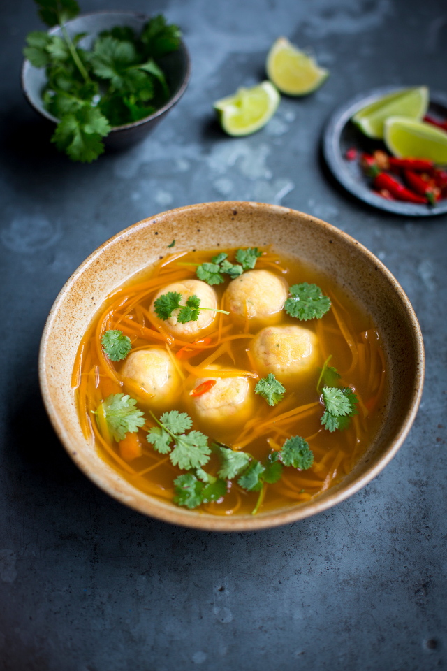 The Thai meatball soup here is a great example of this. Light chicken meatballs seasoned with fish sauce, garlic and chilli bathed in a rich broth with plenty of lime juice and coriander leaves. A trip to Thailand via a warm pot on your kitchen stove!