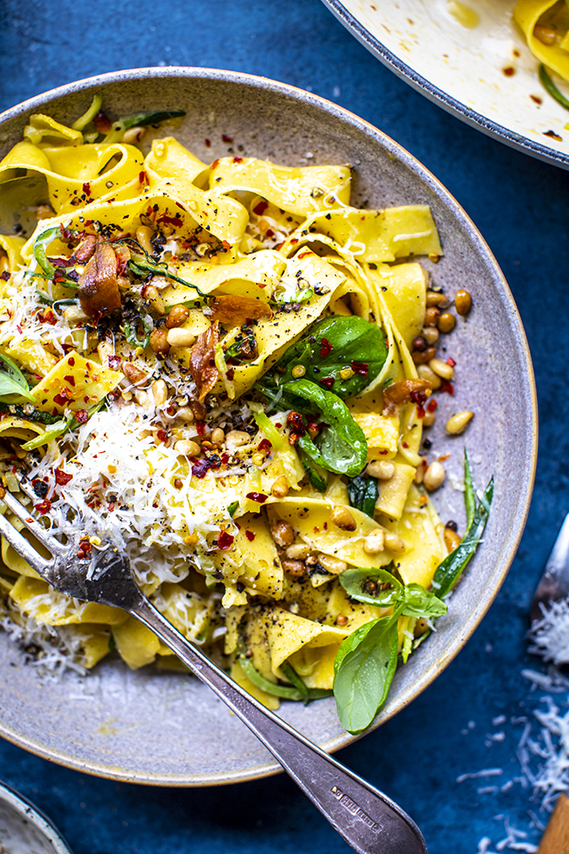 Everyone should have a go to 15-minute pasta recipe. Speedy Green Pasta is the one I pull out particularly at this time of year when the produce needs little extra added. Garlic and chilli warm gently in good olive oil before adding a small summer courgette to the pan. You’re cooking it just enough to soften slightly while the pasta finishes boiling. Toss everything together with lemon juice, pecorino, toasted pine nuts and lots of basil. Simple, fresh, fast and something that’s worth stepping into the kitchen for.