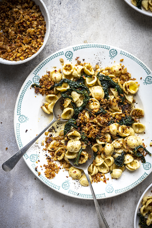 Inspired by our recent trip to Puglia where the pasta grannies make little ear shaped pasta right on the streets of Bari, this Orecchiette with Kale and Spicy Pangrattato is a great way with this humble pasta shape. It’s the crunchy, garlicky breadcrumbs that make this special– a brilliant way to use up old bread and add texture to the dish borrowing from the cucina povera (the traditional Italian frugal cooking techniques). The kale wilts down into the anchovy and garlic base (please, please don’t omit the anchovies- they are essential here), and a splash of pasta water brings everything together into a silky sauce that clings to the orecchiette’s little ear shapes. It’s humble, comforting, and endlessly adaptable.