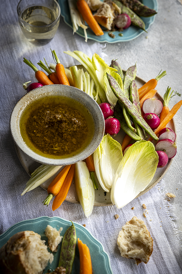 Select an assortment of fresh, interestingly textured vegetables to dip into the warm Bagna Cauda. Think crisp radishes, tender colourful carrots, peppers, wedges of endive and fennel. The platter of colourful crudites makes for a perfect aperitif before any summer supper.