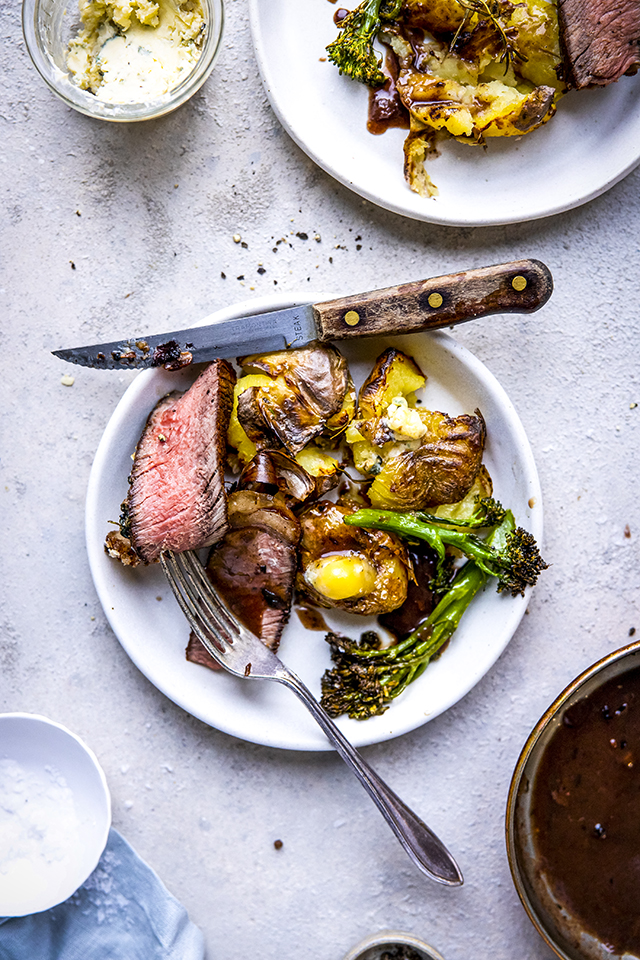 This year we had big dreams of going to Hawaii for a bit of romance but the mere idea of a flight with kids makes me break out in a cold sweat. Next on the list was Palm Springs, the mid century mod desert town famous for being a swinging hot spot for celebs like Frank Sinatra and Elvis Presley in the 50’s & 60’s. Our favourite little spot in Palm Springs is a great steakhouse called Mr. Lyons which delivers on sleek retro booths, martinis and a menu of classics I can totally imagine the rat pack devouring. It’s only two hours in the car from our house in LA but is equally as terrifying as flying so we’ve chickened out and decided to go all in at home and recreate a steakhouse night for two! I know I said we were making more effort, but something I’m sure most parents learn quickly is how to compromise- the joys! Anyway Palm Springs can wait for now, this menu delivers everything you need for a bit of romance. Homemade steakhouse night would not be complete without a serious bitta’ beef, so to give it a slight Irish twist I’ve provided my recipe for a simply cooked rib eye steak shared between two and slathered in butter with Young Buck Blue cheese.
