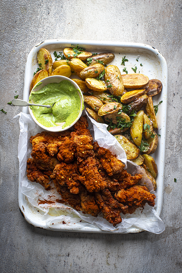 Harissa Fried Chicken with Garlic & Herb Aioli