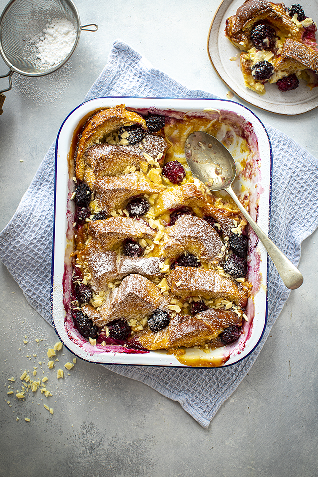 White Chocolate Bread Pudding with Blackberries & Bourbon