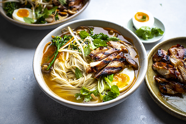 Really good Japanese ramen is an art form that any visit behind the curtains of a ramen joint in Tokyo will prove. The dish which dates back to the 19th century is based on a rich flavoured meat or fish broth, wheat noodles and toppings like thinly sliced pork, boiled eggs, nori seaweed and scallions. Unless you dedicate a lifetime to hand making noodles and perfecting your broth, making it at home will always be a cheats job, particularly if you are making it for a weeknight meal. A fairly good homemade version can be created in minutes and the Charred Chicken Ramen Bowls here are a testament to that. Deep smoky flavour is achieved by griddling chicken thighs that have bathed in soy sauce, mirin and sesame oil. A storebought broth made rich with a steady simmer of garlic, chilli and ginger and the rest, well that’s up to you. The toppings here like brocollini, shitake mushrooms, carrot and soft boiled eggs are interchangeable and considering this cheats version is clearly not about authenticity, it allows us to make use of veggies that we might have to hand. A warm and comforting bowl for when the weather turns but you still need to spice up the midweek offering.