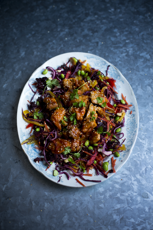 Lastly in this chicken trio of light midweek meals, a great light dinner, which relies on spice and heat is the simple Spicy Sriracha Chicken Salad here. A sticky, salty and spicy marinade becomes the sauce for the addictive little nuggets that top a rainbow platter of shredded red cabbage, shaved peppers and edamame beans for a light but incredibly satisfying meal in minutes.