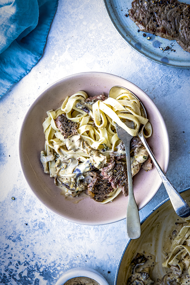 In the vein of weeknight comfort, a quick fix steak supper is also on the menu and a great addition to any weekly meal plan for its simplicity. Creamy pasta with mushrooms and minute steaks seared in a snap make for an easy supper plonked straight to the table for everyone to help themselves.
