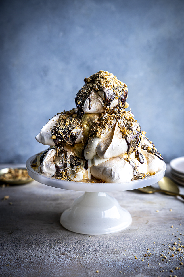 My wife Sofie introduced me to this classic Swedish kiddie-style dessert, which I’m guessing is the Scandi version of Eton Mess. It’s basically lightly crushed meringues with whipped cream, banana slices and chocolate sauce. My version is slightly more sophisticated, though I don’t that say directly to my darling wife. It’s a tower of chewy, crisp meringues, piled high with ice cream, whipped cream and warm chocolate sauce. It’s wonderfully messy and always garners the best reaction from guests. You can add fresh fruit, flaked almonds or caramelised bananas and passion fruit pulp. Be sure to choose a platter with a generous lip, as this is a messy one to serve – embrace it!