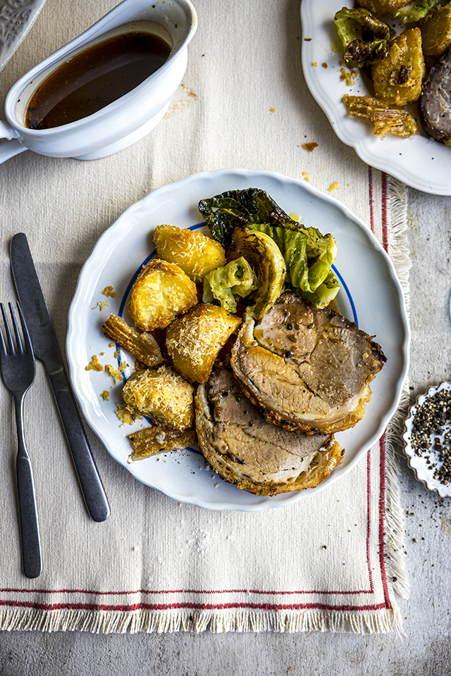great produce this little island has to offer. Fresh seafood, farmhouse cheese, organic vegetables and bloody good meat. The Aga, with which I had a love/hate relationship, was good for one thing, and that was slow-roasting. A stroll to Higgins, our local butcher, resulted in this pork shoulder, which I excitedly served with charred garlic scapes from Drummond House. (Our friends Jeni Glasgow and Reuven Diaz served them as part of the main course at our wedding, and we’ve been obsessed with them ever since.)