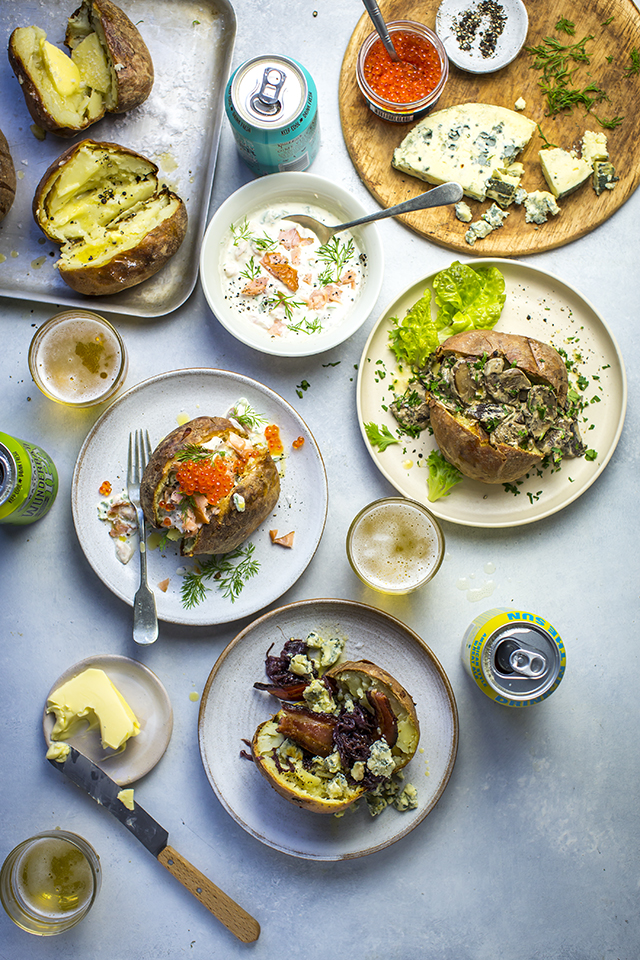 I always find there’s something wonderfully nostalgic about a baked potato. My mum used to make them to serve alongside beef bourguignon or stroganoff as a steaming hot side, burst open to reveal a fluffy interior begging for salty Irish butter. I have found a love for them again recently and they are perfect comfort food with plenty of filling options to choose from. Serve them as they are or with some winter leaves with a shimmer of sharp mustardy dressing.