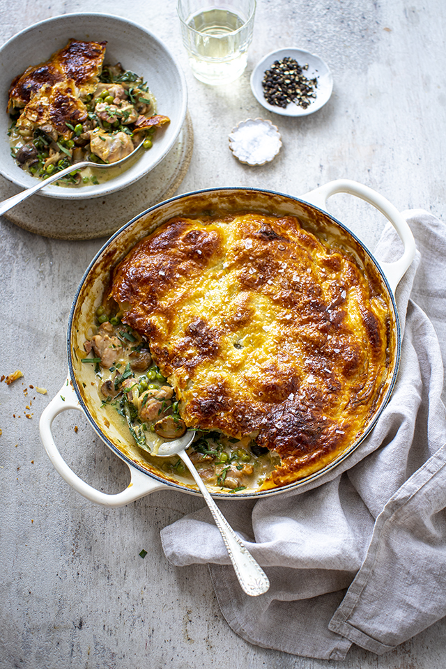 If you want comfort food on a plate you will find it in this pie that instantly evokes all the cosiness of crisp Autumn evenings. It’s a simple creamy chicken & mushroom filling that can be levelled up with the fanciest looking mushrooms you can find and even a splash of marsala for some depth. As it’s a wonderful one to serve to kids, I add spinach and peas and whatever other veggies I have in the fridge chopped finely alongside to up the nutritional value.