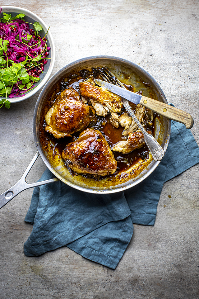 A recipe that can be easily cooked on the hob top but also works particularly well once a little smoke and flame hits the chicken skin. I would suggest you grill the chicken thighs, seasoned over flame until all but cooked and then finish them in the pan of sticky rub red sauce that makes them fairly addictive. Served up with red onion, coriander and ruby jewels of pomegranate, you will be left with a dish sure to brighten up even the darkest January day.