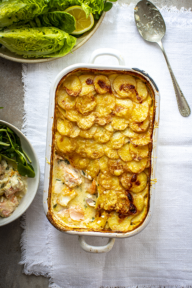 A slightly fancier finish to a traditional fish pie, this version has a scalloped potato topping above a creamy, cheesy smoked fish filling that is particularly delicious. I often think of fish pie as a weeknight dinner but with a dish like this, there’s no reason you couldn’t serve this as your Sunday centerpiece. Maybe add a few scallops or other shellfish for extra indulgence but I know our crew would happily devour this whenever we choose to serve.